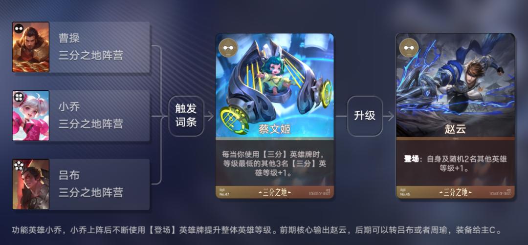Take the "Three Kingdoms" camp that the author often uses as an example. After awakening, Diaochan's "On - Play" effect can increase the level of heroes in the same camp by 2. Zhao Yun can increase the level of himself and two random heroes by 2. Cao Cao's "Prepare" effect can randomly trigger the "On - Play" effects of two heroes in the same camp, and Xiao Qiao can increase the level of all heroes by 1 whenever a hero triggers an "On - Play" effect. Just Cao Cao can bring a total level increase of more than 25 to the team every round. Moreover, there are also many powerful effect cards for a single camp in the game.
