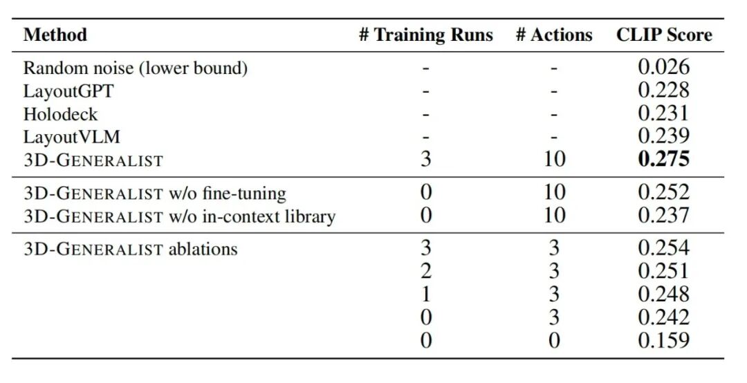 After three rounds of self - improvement fine - tuning, the CLIP score of 3D - GENERALIST reaches 0.275, significantly higher than the version without fine - tuning and the version without an action code snippet library, and it can iteratively correct scene defects.
