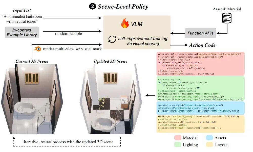 Subsequently, the VLM will directly output specific action instructions in code form, such as adding assets, adjusting lighting, and changing materials. These code instructions will be connected to the tool API of the 3D environment, and the API will automatically execute the instructions to update the entire 3D room in real - time.