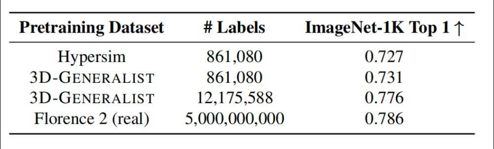 When pre - training the visual model ImageNet - 1K Top - 1 with synthetic data generated by 3D - GENERALIST using 860,000 labels, the accuracy reaches 0.731, exceeding that of the manually constructed HyperSim dataset.