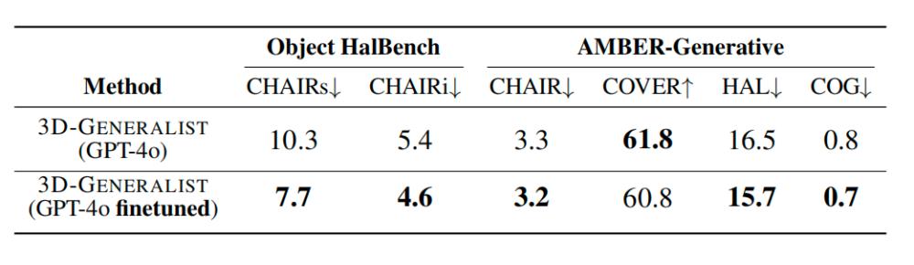 The introduction of the self - improvement fine - tuning technology also reduces the visual hallucination rate of the VLM. In the Object HalBench and AMBER benchmark tests, the hallucination - related indicators of the fine - tuned model are better than the original GPT - 4o.