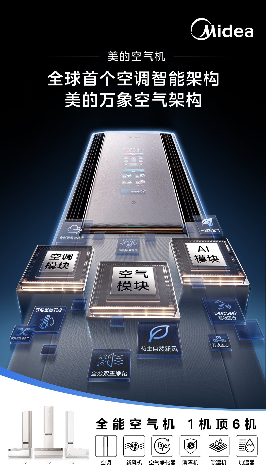 Midea's air machine family is a "new species" in the air - conditioning industry born based on Midea's All - Round Air Architecture. Represented by the Midea Air Machine T6 as the flagship, through the collaboration of the air - conditioning module, the air module, and the AI module, it integrates the originally scattered air - related capabilities into a system, truly achieving "one machine replacing six machines".