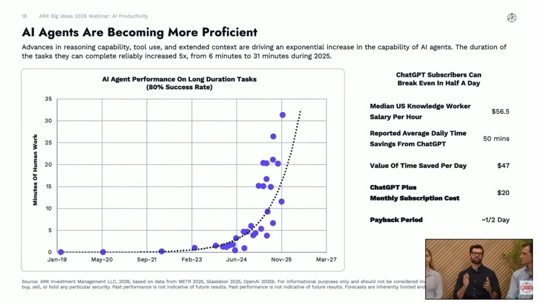In the enterprise knowledge - based work area, since the end of last year, there has been a fundamental turning point in the long - term inference ability of models. The average duration that an AI agent can reliably complete tasks has increased from 5 minutes to more than 55 minutes without constant human supervision. This greatly enhances enterprises' willingness to pay, because the monthly subscription fee for a basic enterprise - version chatbot can be recouped by an employee saving less than one day's work time. As for distinguishing hype from real signals, we see that the revenues of cloud service providers such as AWS, Azure, and GCP are all growing at an accelerating rate. GCP even achieved a 48% year - on - year growth, which proves that the actual demand for computing power has created huge new revenue.