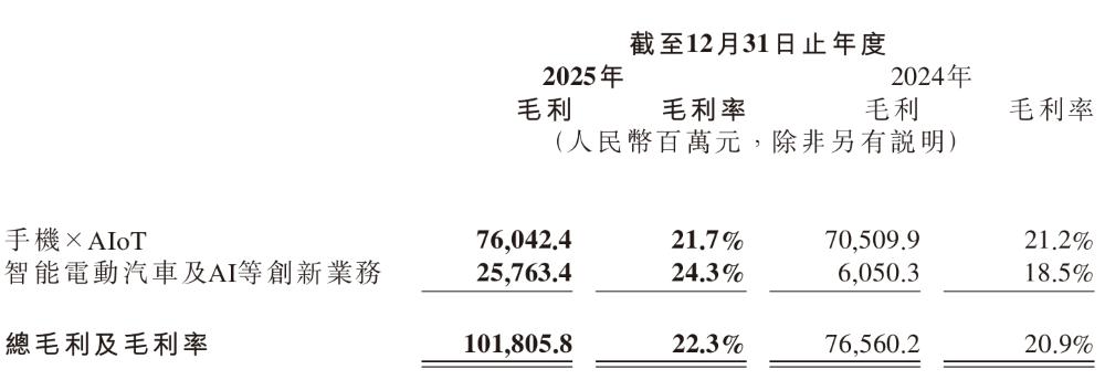 In terms of gross profit margin, in 2025, the gross profit margin of Xiaomi Group's intelligent electric vehicle and AI and other innovative business segment was 24.3%, an increase of 5.8 percentage points compared to 18.5% in 2024. Xiaomi stated that this was mainly due to the delivery of the Xiaomi SU7 Ultra and Xiaomi YU7 series, as well as the increase in the gross profit margin of other related businesses.