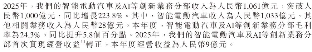 Meanwhile, in 2025, Xiaomi Group's intelligent electric vehicle and AI and other innovative business segment achieved positive operating income (gross profit minus operating expenses) for the first time. The operating income in 2025 was 900 million yuan.