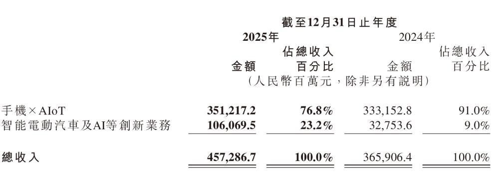In 2025, the intelligent electric vehicle and AI and other innovative businesses accounted for 23.2% of Xiaomi Group's total revenue, an increase of 14.2 percentage points compared to 9.0% in 2024.
