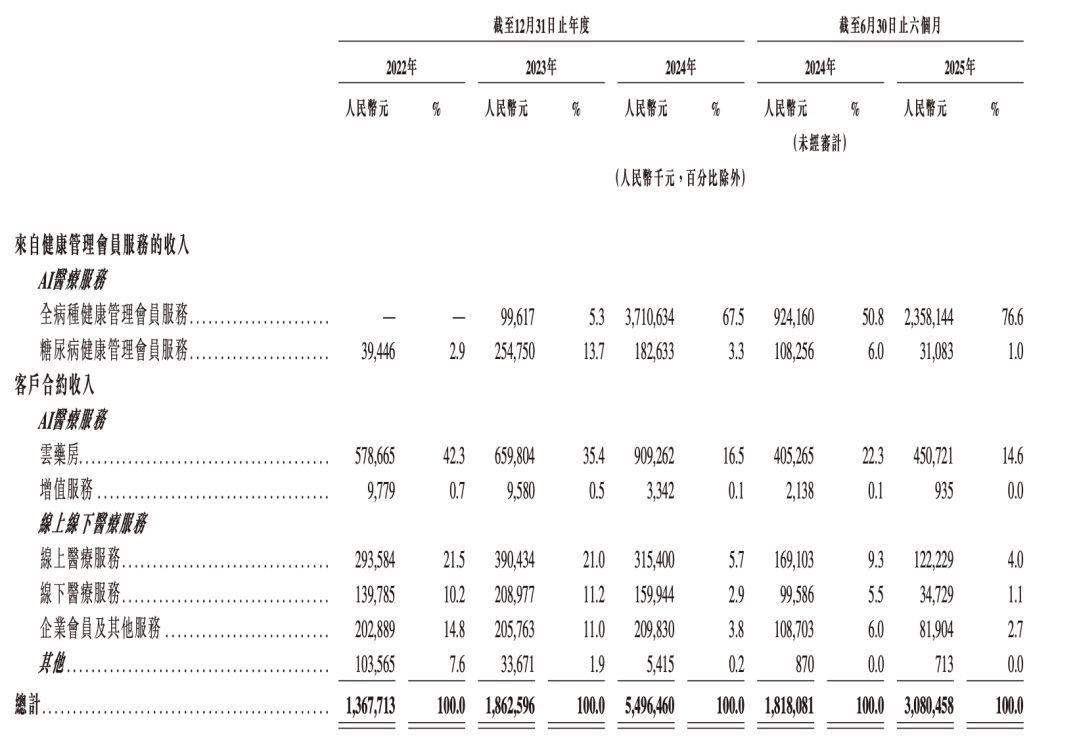 In the first half of 2025, WeDoctor presented an impressive report card: the total revenue reached 3.08 billion yuan, with a year - on - year growth rate of nearly 70%. In terms of structure, the revenue from the health management membership service of the "HSC" soared to 2.389 billion yuan, a year - on - year increase of 131%, completely replacing the traditional cloud pharmacy business (revenue of 450 million yuan, a year - on - year increase of 11%), and establishing its position as the core growth engine of the company. From the development trend, it is not difficult to predict that in the second half of 2025, WeDoctor will still maintain a high - growth trend with a revenue growth rate of over 100%.
