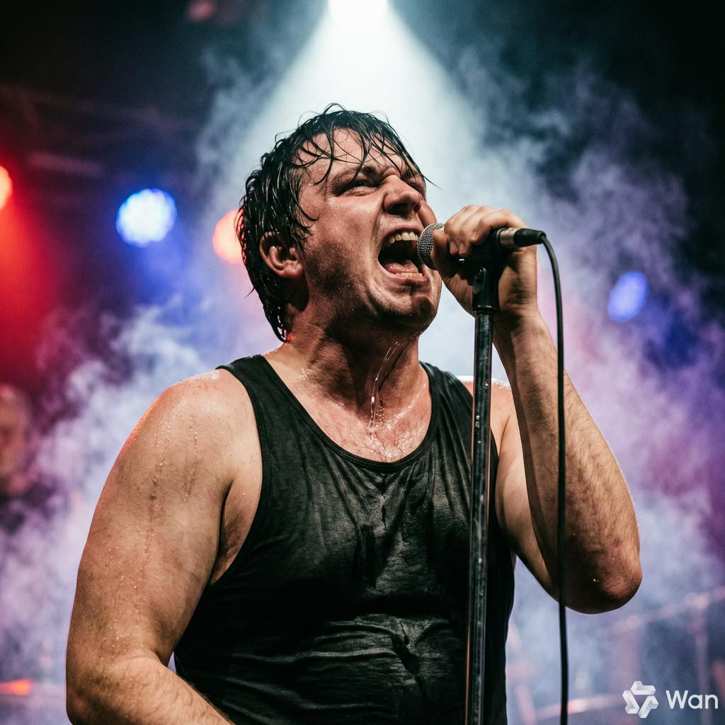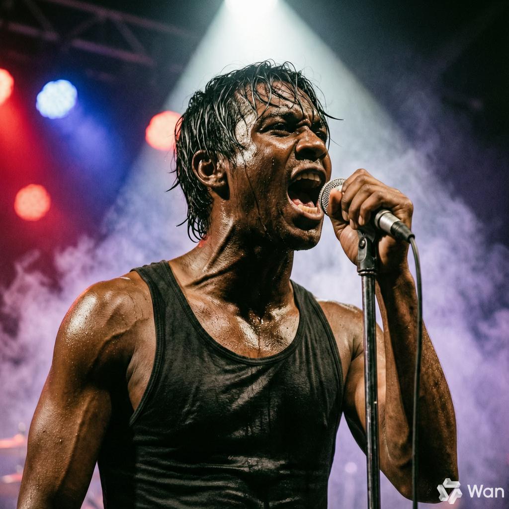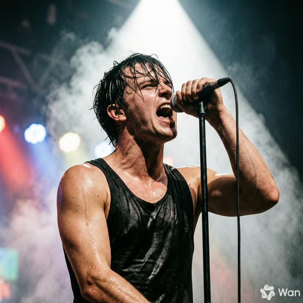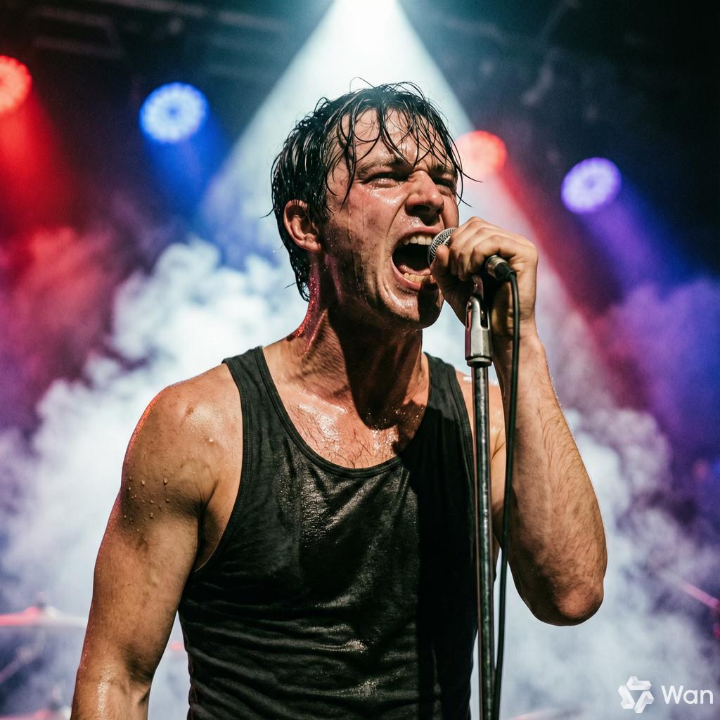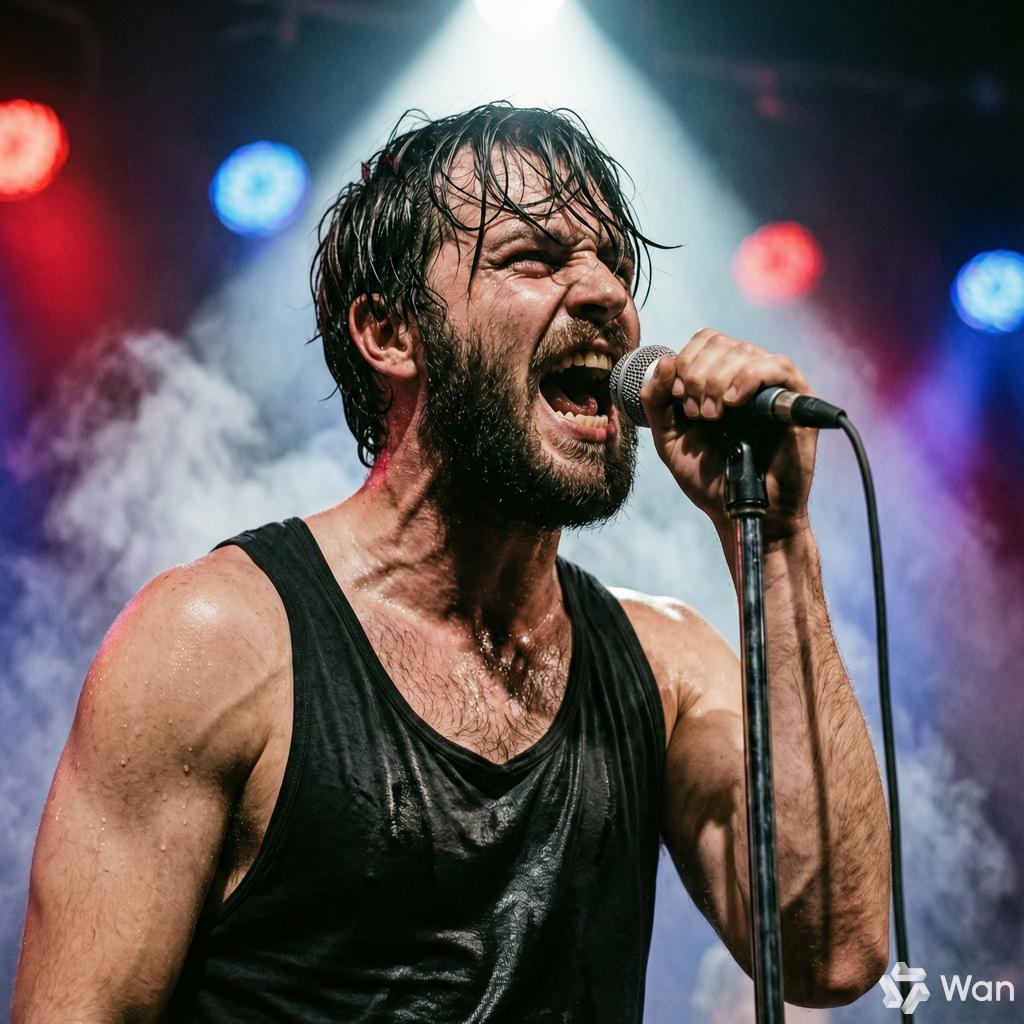 A front-facing half-body portrait of a male band lead singer with [appearance settings] performing on stage. He holds a standing microphone with one hand, tilts his head slightly back and roars. Sweat slides from his forehead to his jawline, and his damp black short hair sticks to his forehead and temples. He is wearing a black vest soaked in sweat, with clear muscle lines on his collarbone and arms. The top light on the stage shines directly from above, creating a strong contrast between light and shadow. The background is a blur of colorful stage lights and smoke. It has a style of candid shots at a rock concert, with a high ISO grainy effect, and an 85mm lens.