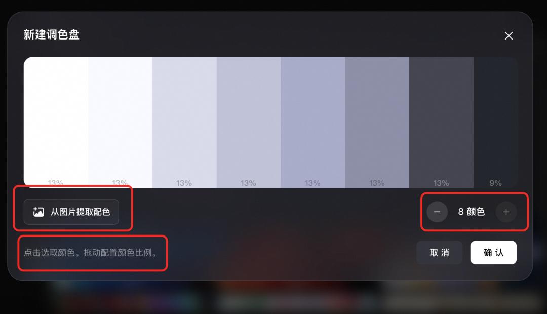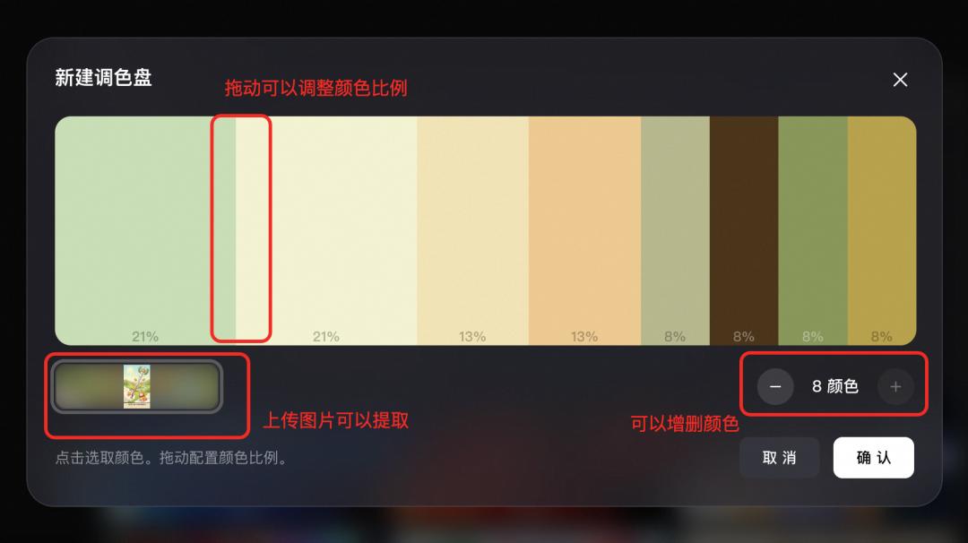 Click "Add a new color scheme," then click "Extract color scheme from image," upload any reference image, and the system will automatically extract the main colors and their proportions.