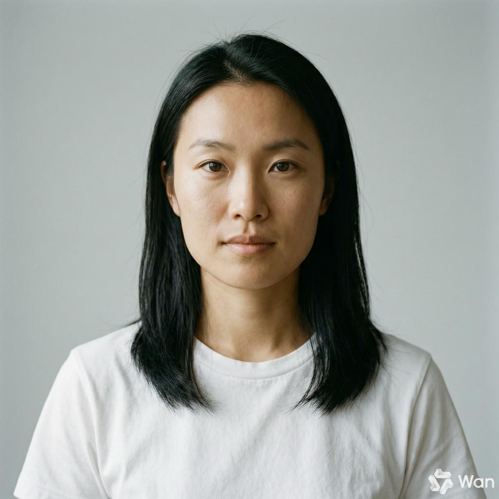 A front-facing half-body portrait of a 25-year-old East Asian woman with [face shape settings], natural light, looking directly into the camera, with long black straight hair falling over her shoulders, wearing a white round-neck T-shirt, against a solid light gray background. It has a realistic photography style, a 35mm lens, and a shallow depth of field.