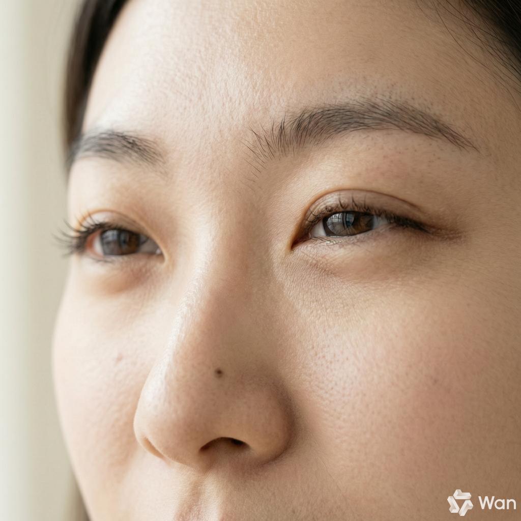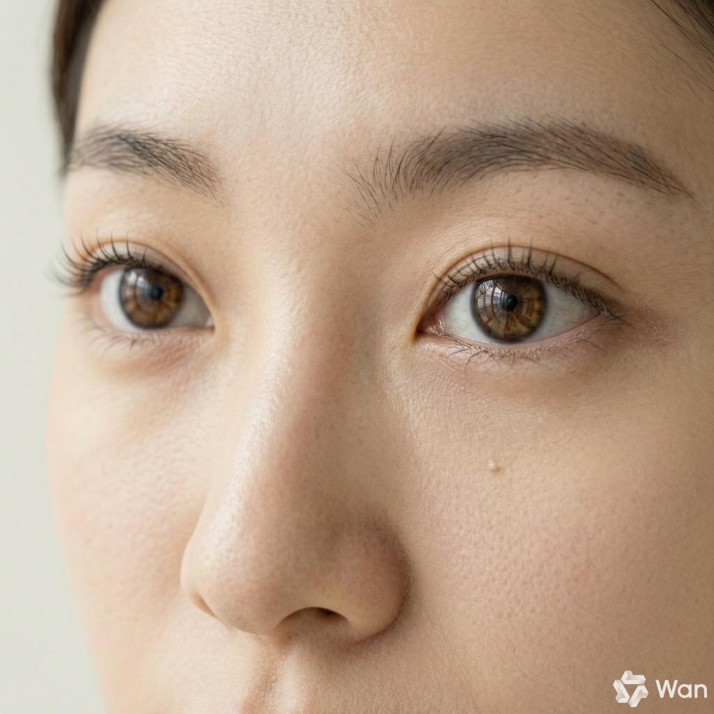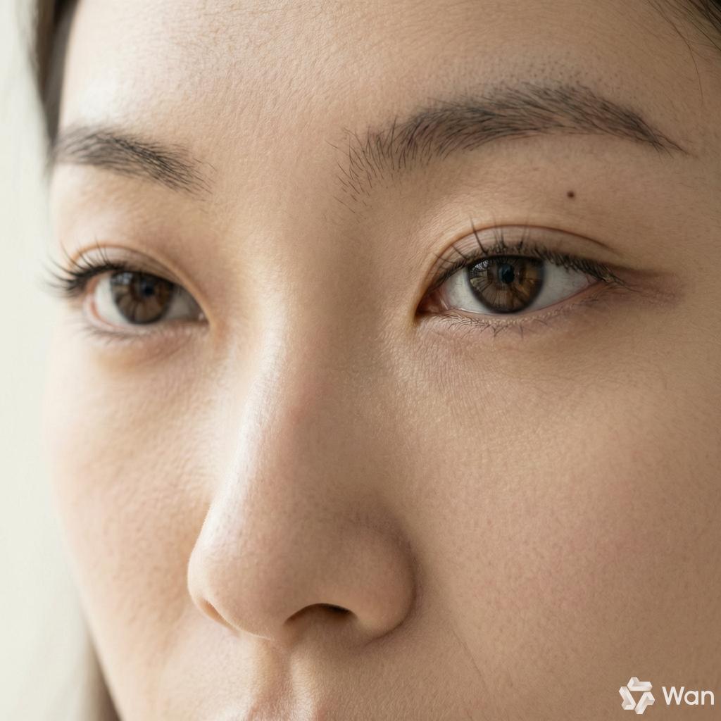 A super-close-up facial shot, capturing only the area from the eyebrows to the tip of the nose. A 25-year-old East Asian woman with [eye settings], with delicate skin and a pore texture. Natural light shines gently from the front. She has no makeup, a natural face, with distinct eyelashes. The iris is dark brown with visible texture, and there is a small mole at the corner of her eye. The background is completely blurred into a milky white. It has a macro photography style, a 100mm macro lens, and ultra-high definition.