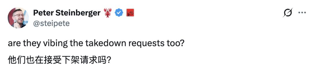 Peter, the father of the lobster, who was following the drama closely, immediately rushed to the scene and joked that all of Anthropic's take - down requests were from an automatic deletion program Vibe Coding.