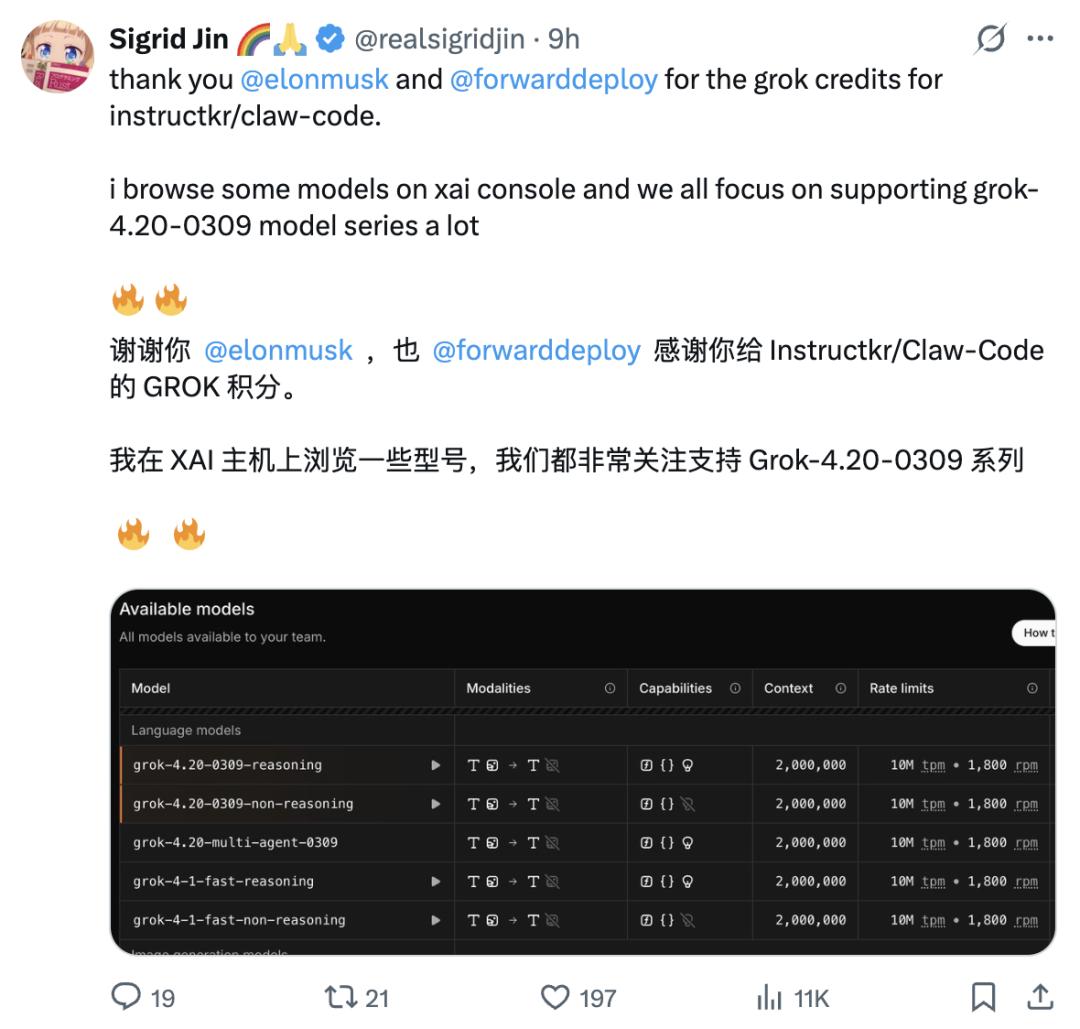 Jin posted a message to thank Elon Musk, saying that xAI gave him a lot of Grok credits, which greatly helped with the rewrite of Claw Code.