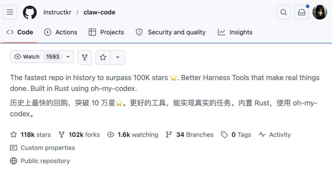 Two days have passed. The Claude Code source code cloning project not only survives but has also become the fastest project to reach 100,000 stars in history.