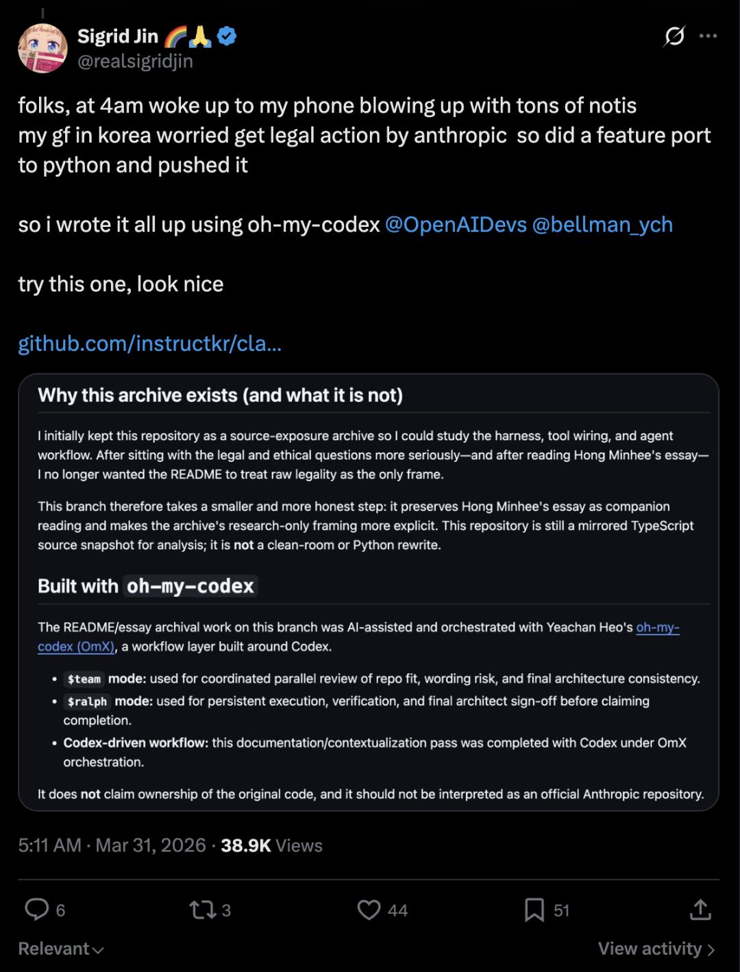 It's bad enough that Claude Code was leaked, and xAI is adding fuel to the fire, helping developers with the quick porting, as if they're afraid that Anthropic will take down the project with just one email.