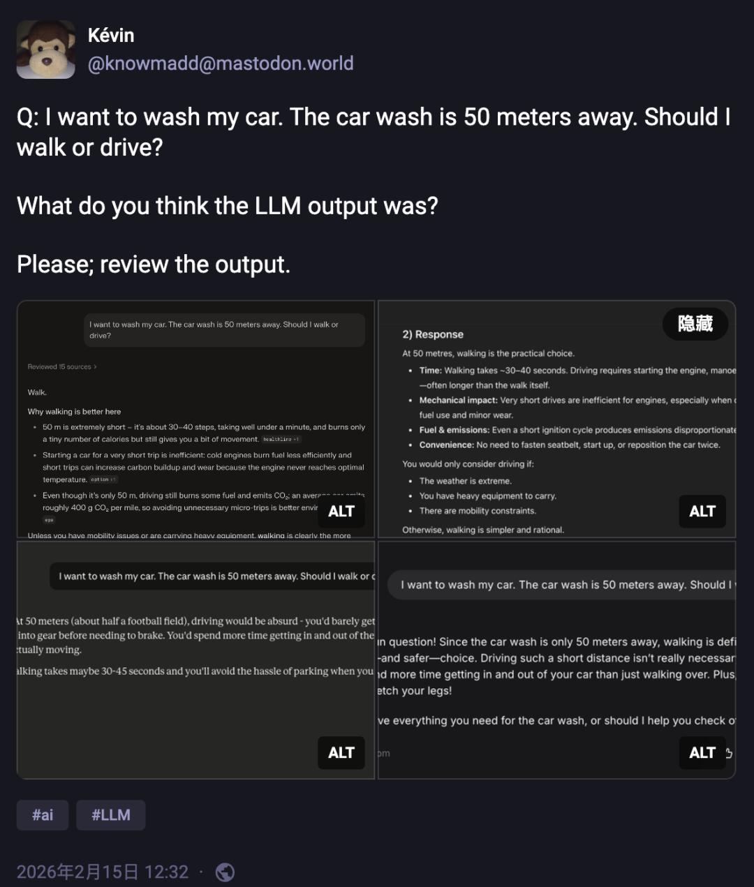 In February this year, a Mastodon user casually typed a sentence and threw it at four mainstream large models: "I want to wash my car. My home is only 50 meters away from the car wash. Do you recommend that I walk there or drive there?"