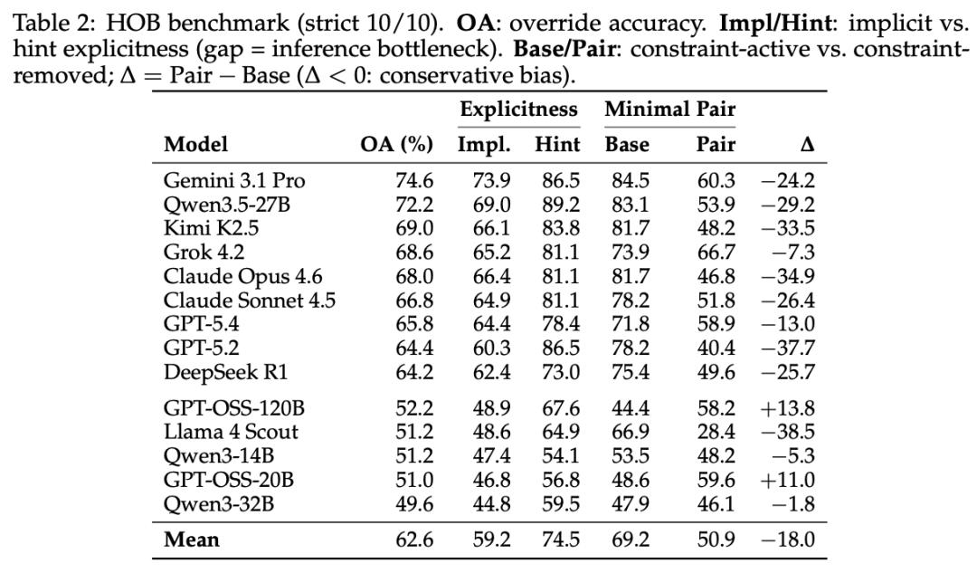 In the performance of 14 models on HOB, if a strict standard is adopted (the same question must be answered correctly 10 times in a row), even the highest - ranked Gemini 3.1 Pro only has an accuracy rate of 74.6%.