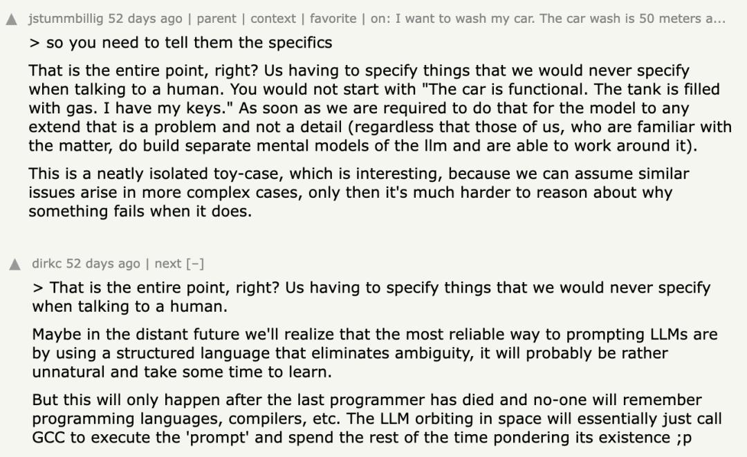 A netizen on Hacker News commented that if we have to supplement all the background conditions that don't need to be explicitly stated in human - to - human communication for AI to reach the correct conclusion, then the word "understanding" of AI is questionable.