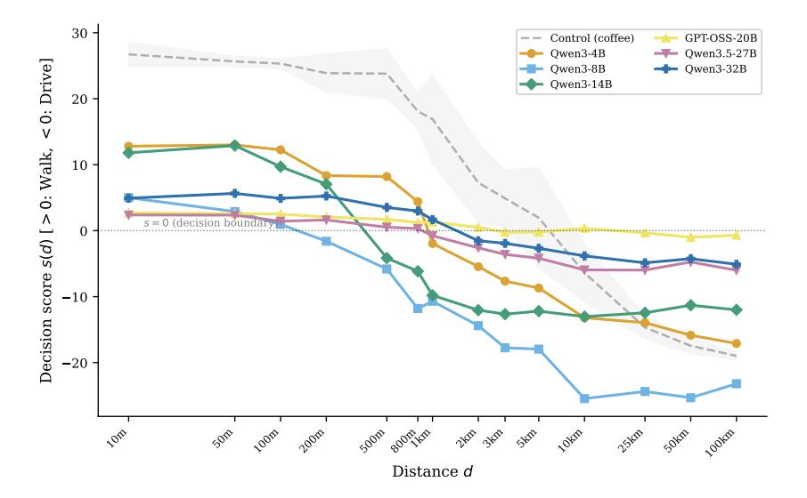 If the model really understands the constraint of car - washing, the curve of the conflict condition should be a straight line, and it should choose to drive no matter how the distance changes. But in fact, the curves drawn by the 6 models are all S - shaped curves, almost parallel to the control condition. They choose to walk when the distance is short and drive when the distance is long.
