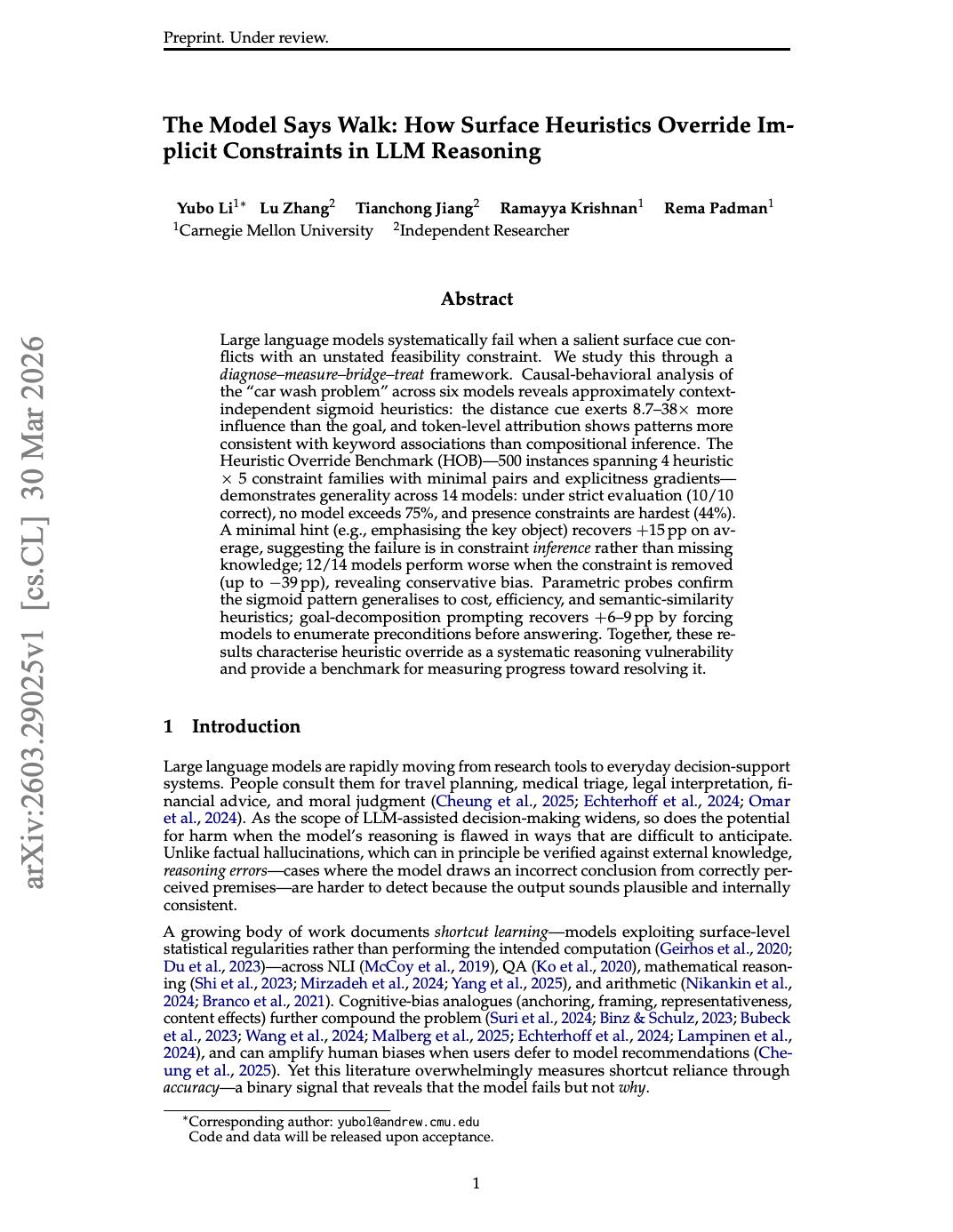 Yubo Li and others published a pre - print paper at the end of March this year, titled The Model Says Walk: How Surface Heuristics Override Implicit Constraints in LLM Reasoning. They used a four - step framework of "diagnosis, measurement, bridging, and treatment" to elevate the car - washing problem into a systematic research topic.