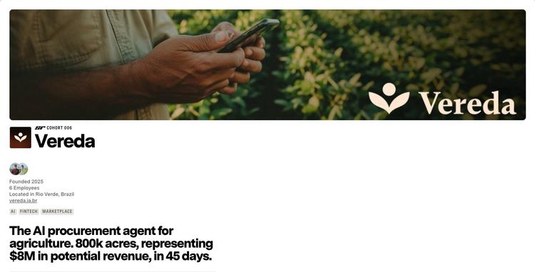 "Boring industries" are the third face. Heavi provides AI labor for heavy vehicle maintenance. With a 2 - person team, the two founders have raised a total of $275M before. Railways, agriculture, heavy vehicles - these industries have a huge TAM but extremely low digitalization levels, and few entrepreneurs were willing to touch them before. Under the same logic, there are also Kaaro (a railway AI agent, 2 people, ex - Toma/a16z alumni) and Vereda (an AI procurement platform for agriculture, from Brazil, covering 800,000 acres in 45 days). The more boring the industry, the less competition there is, and the stronger the customers' willingness to pay.