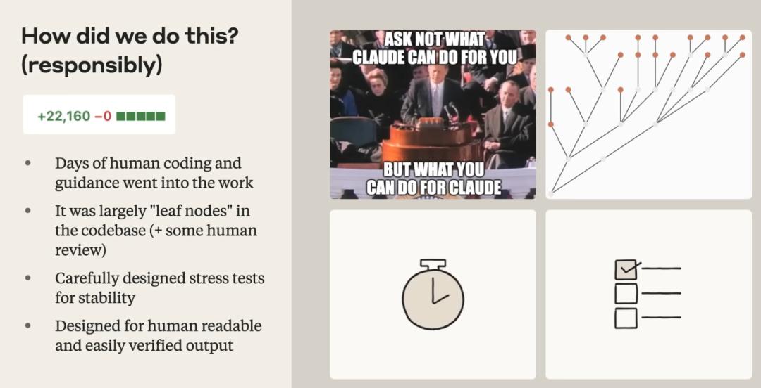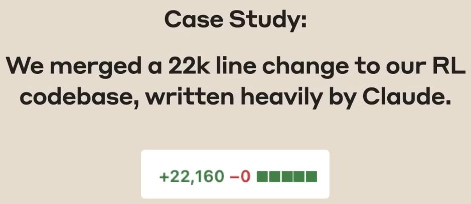 In the speech, Erik Schluntz disclosed an extreme real - world case within Anthropic. His team recently successfully merged a code modification of up to 22,000 lines in the production environment of a reinforcement learning codebase, and the vast majority of it was written by Claude.