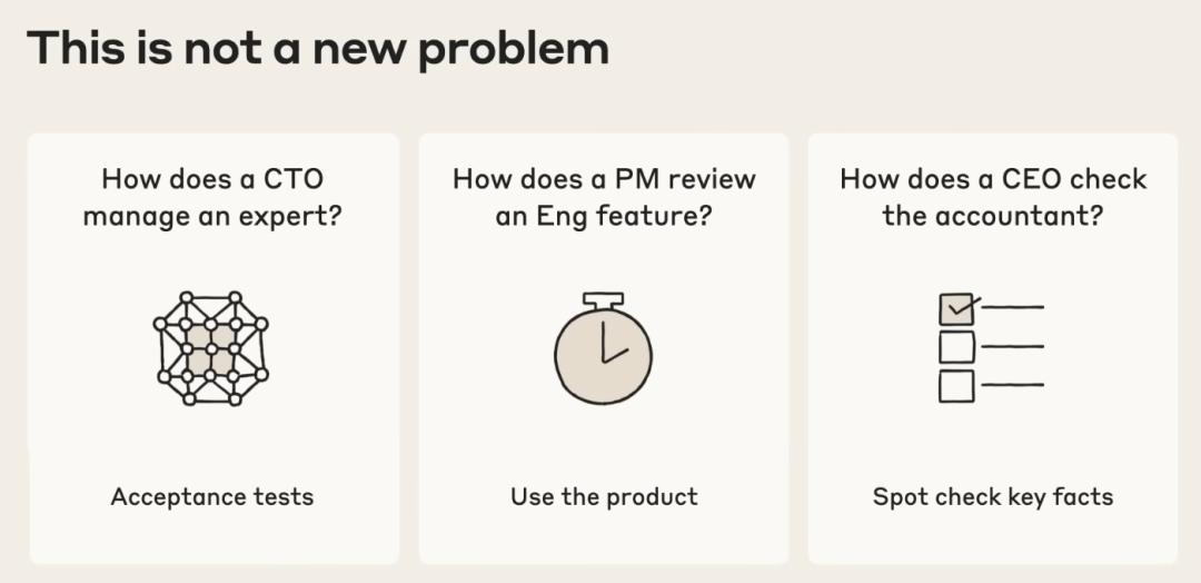 In modern enterprise management, CTOs rely on acceptance tests to manage technical experts, product managers verify functional designs by experiencing products, and CEOs spot - check financial models through key data slices. They don't delve into the most basic execution details. Software engineers also need to establish similar abstraction layers that can be verified without reading the underlying code.