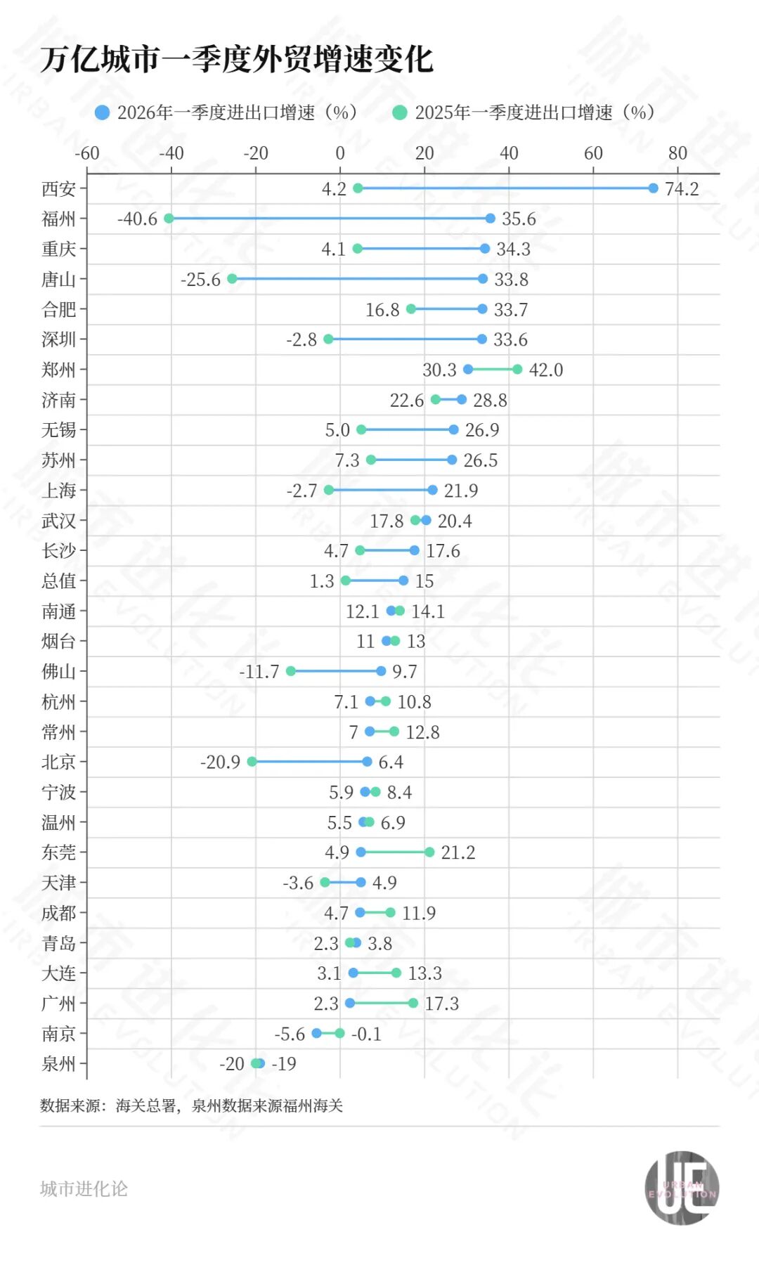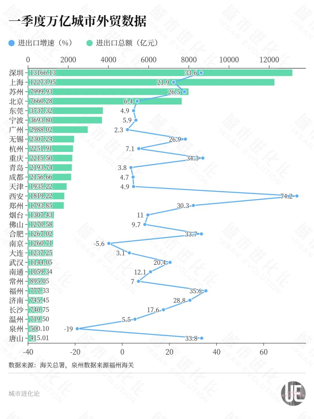 This import and export growth rate leads all trillion - level cities in the country, leaving the second - ranked Chongqing nearly 40 percentage points behind. It also breaks last year's record set by Zhengzhou, raising the "ceiling" of the first - quarter foreign trade growth rate champion of trillion - level cities by more than 30 percentage points. What a strong momentum!