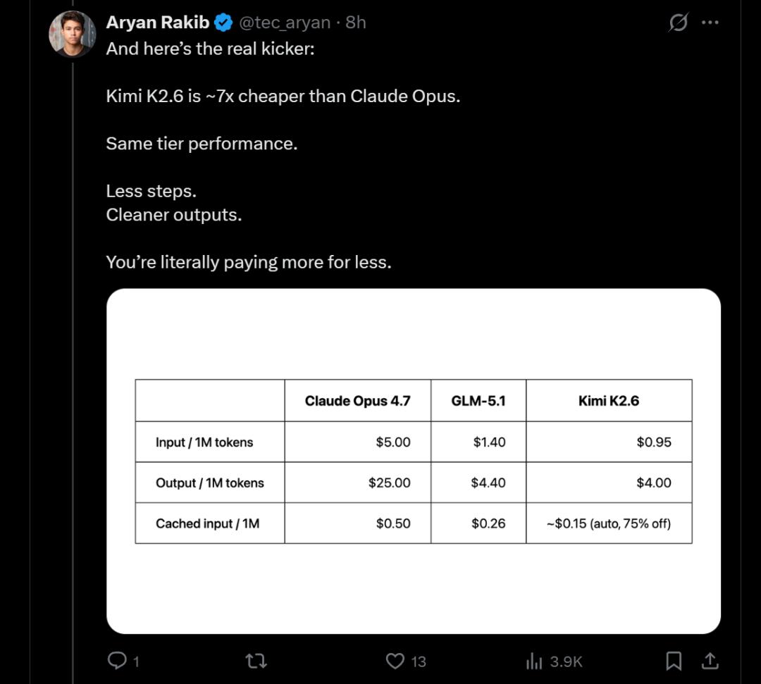 More importantly, Kimi K2.6 is seven times cheaper than Claude Design.