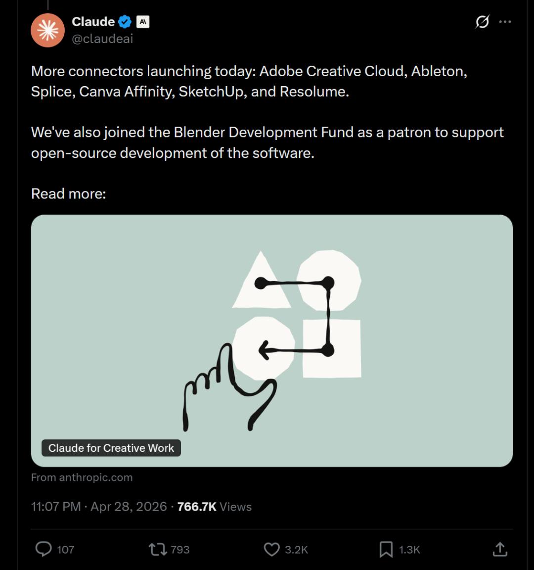 That is to say, Claude has now integrated into the software that creative people use every day.