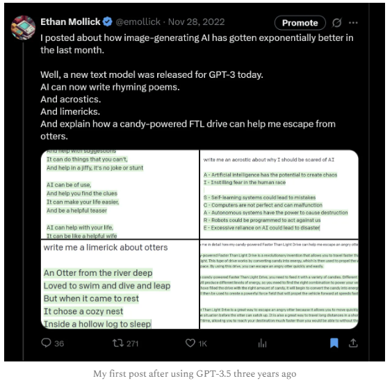 Gemini: "Klar kann ich das. Ihr Tweet stammt aus November 2022 - der Nacht vor der modernen KI - Boom. Damals war das größte 'Wow' - Moment, dass die KI einen zusammenhängenden Text schreiben oder ein kleines Gedicht zu einem albernen Thema wie 'Bonbon - getriebenes Überschallschiff flieht vor Ottern' verfassen konnte.