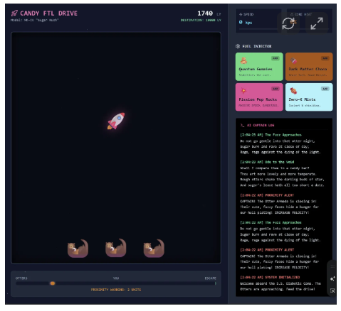 Es hat tatsächlich ein Minispiel erstellt: Ich musste mich mit Bonbonenergie vor verfolgenden Ottern retten, wobei zwischendurch Gedichte und verschiedene lustige Updates auftauchten. Die Leser dieses Blogs wissen wahrscheinlich bereits, dass die KI Code schreiben kann. Interessanter ist jedoch - was kann Gemini 3 tun, wenn man es nicht mehr als 'Chatfenster', sondern als 'etwas anderes' ansieht?