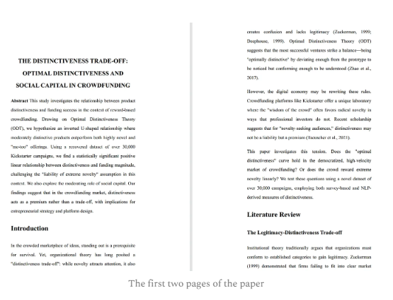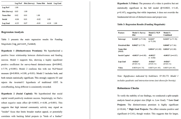 Noch beeindruckender ist, dass es einen eigenen Indikator entwickelt hat: Es hat mit NLP die Projektbeschreibung mit einer großen Anzahl von Beschreibungen mathematisch verglichen, um die "Eigenart der Crowdfunding - Ideen" zu messen. Es hat den Code selbst geschrieben und die Ergebnisse selbst überprüft.