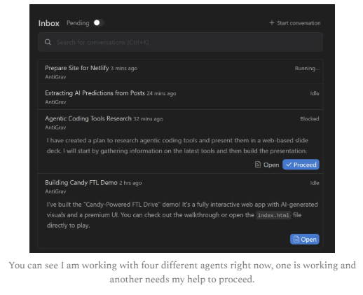 Gemini 3 ist extrem gut darin, Code zu schreiben, und das betrifft Sie auch, wenn Sie sich nicht als "Programmierer" bezeichnen. Ein grundlegendes Konzept in der KI - Welt ist: Alles, was Sie auf einem Computer tun, ist letztendlich Code. Wenn die KI Code schreiben kann, kann sie Dashboards erstellen, Websites scrapen, Präsentationen erstellen, Dateien lesen... Dies macht den "Code schreibenden Agenten" zu einem universellen Werkzeug. Antigravity macht dieses Konzept zu einem Produkt: Geben Sie mir einen "Posteingang", und ich weise die Aufgaben an die Agenten zu. Sie benachrichtigen mich, wenn sie Genehmigung oder Hilfe benötigen.