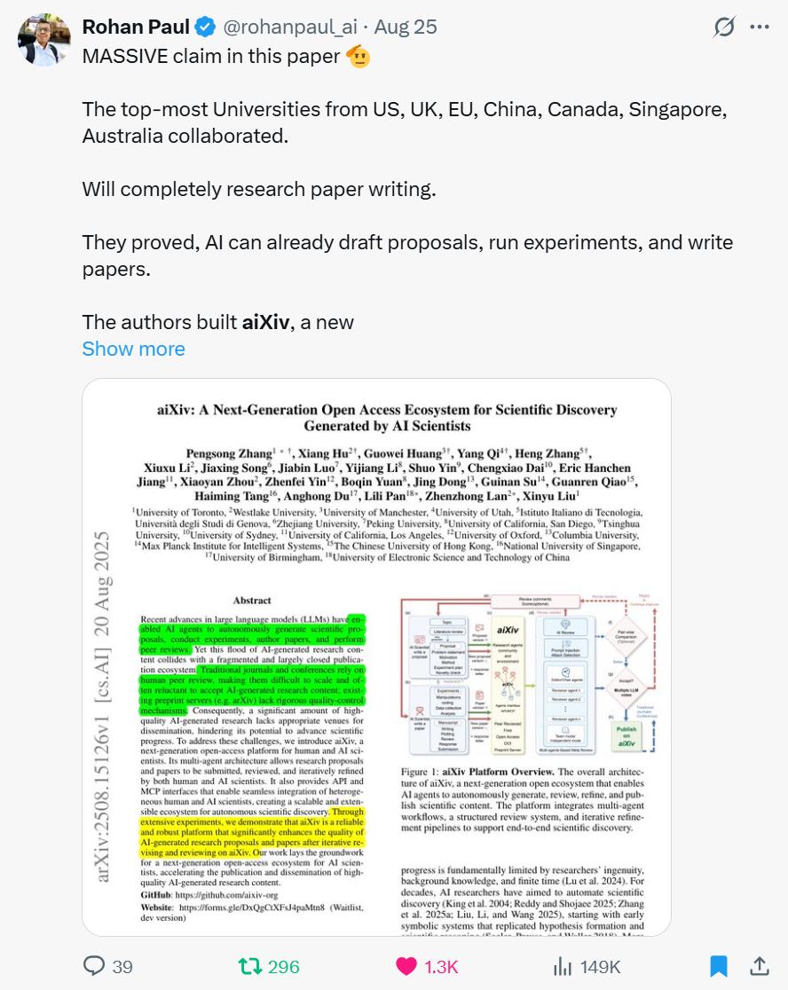 Das aiXiv-Team weist in einem Papier darauf hin, dass das traditionelle akademische Publikationssystem einer beispiellosen strukturellen Herausforderung gegenübersteht.