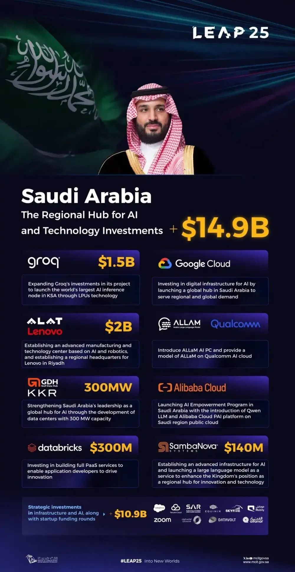 Im Februar dieses Jahres auf der Konferenz LEAP 2025 in Riad, Saudi-Arabien, kündigten bekannte Technologieunternehmen Investitionen in Höhe von 14,9 Milliarden US-Dollar an.