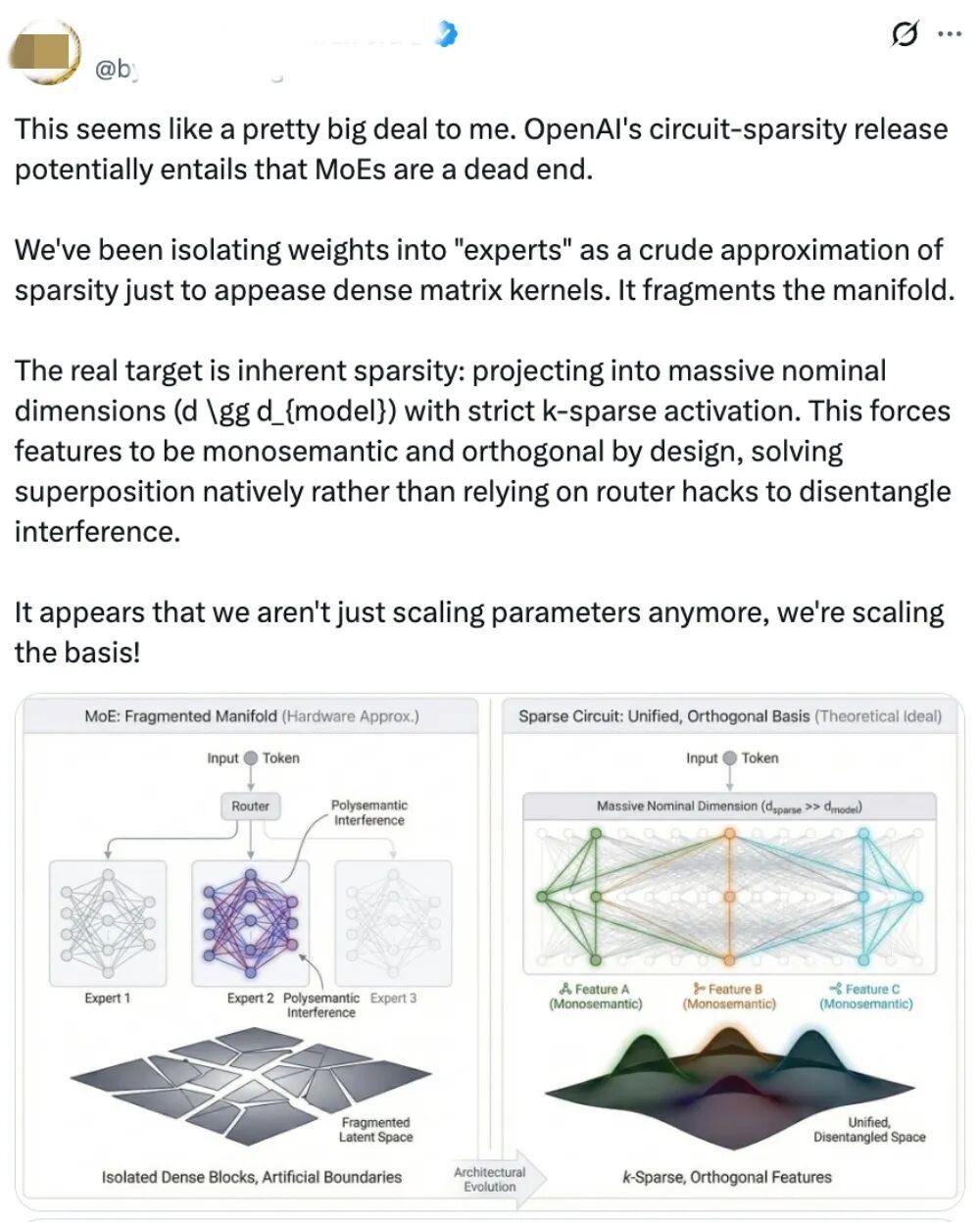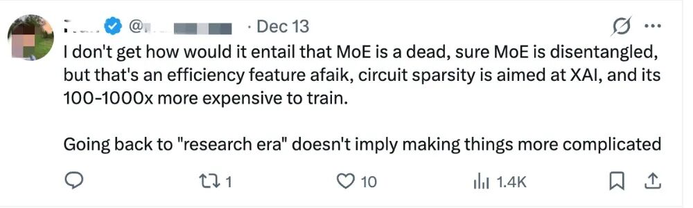 Einige Internetnutzer sind jedoch anderer Meinung. Sie sagen, dass sie nicht verstehen, warum das MoE-Modell damit am Ende sein soll. Sie erklären weiter, dass diese Technologie auf XAI (Interpretierbare KI) abzielt und die Trainingskosten um das 100- bis 1.000-fache höher sind. Ein Rückgang in die "Forschungszeit" bedeutet nicht, dass die Dinge komplizierter werden.
