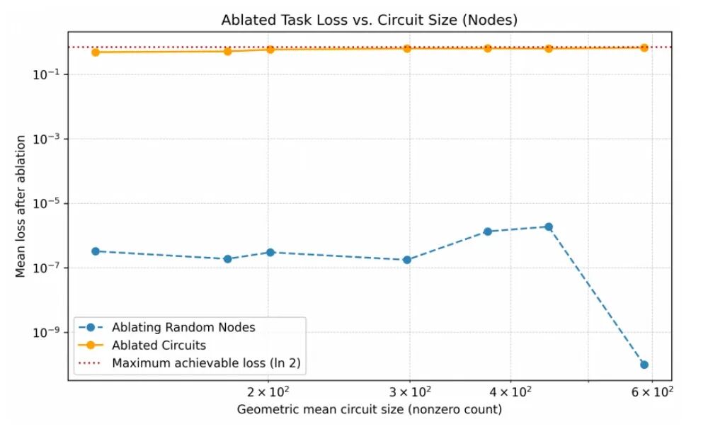 3. Reduzierung der Größe um das 16-fache: Vergleichsexperimente zeigen, dass bei derselben Aufgabenverlustrate die Schaltkreise des spärlichen Modells um das 16-fache kleiner sind als die des dichten Modells. Dies bedeutet, dass die Schwierigkeit, das Denken der KI zu verstehen, um eine ganze Größenordnung gesenkt wird.