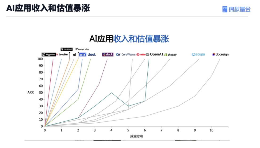 Eine andere von ihr gezeigte Diagrammgruppe zeigt, dass die Zeit, die AI-Anwendungsunternehmen benötigen, um ein Jahresumsatz von 100 Millionen US-Dollar zu erreichen, deutlich kürzer ist und oft nur die Hälfte oder sogar ein Drittel der Zeit beträgt, die herkömmliche Softwareunternehmen benötigen. Dies zeigt, dass die Künstliche Intelligenz ein Wachstumsverstärker wird, wenn das Produkt klar definiert und die Umsetzungskapazität stark ist.