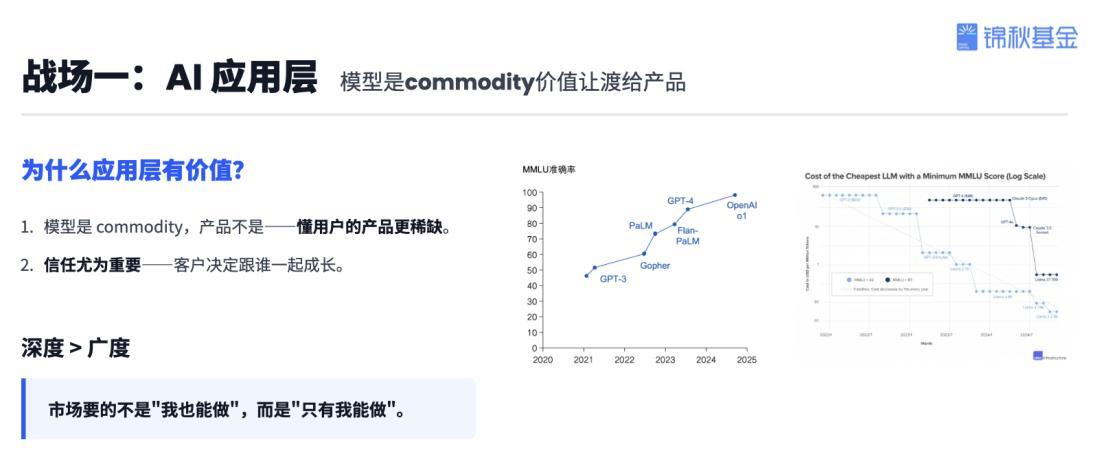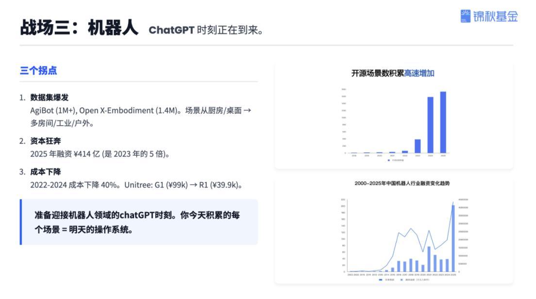 Yang Jie hat die gegenwärtigen AI-Chancen in drei "Schlachtfelder" unterteilt: die Anwendungs-Ebene, die Ebene der Rechenleistung/Chips und die Ebene der Robotik/Embodied Intelligence.
