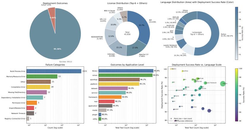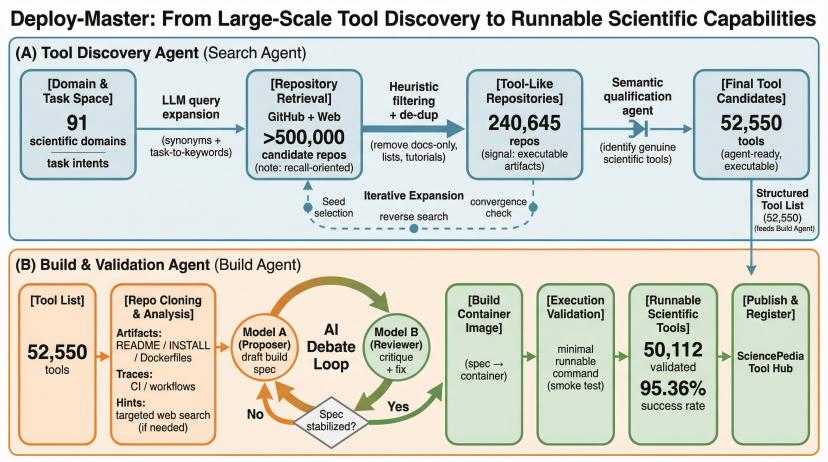 In den letzten Jahrzehnten ist in der Wissenschaftlichen Computation eine unzählige Anzahl von Open - Source - Tools entstanden, doch nur wenige von ihnen sind „out - of - the - box“ einsetzbar. DeepPotential Technology's Deploy - Master konzentriert sich auf die Ausführung und nutzt einen automatisierten Workflow, um das gleichzeitige Deployen und Validieren von über 50.000 Tools in einem Zug zu ermöglichen, was den Weg für Agentic Science ebnet.