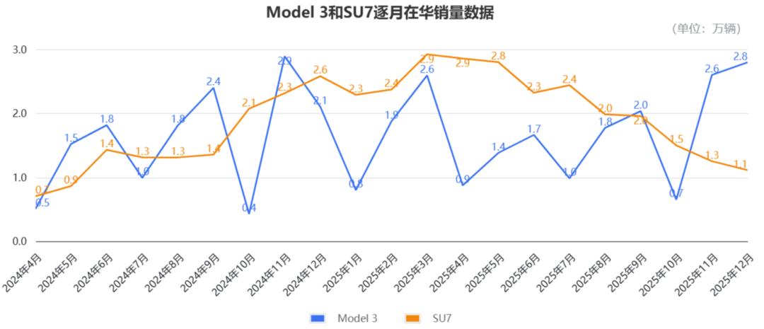 Tatsächlich hat das SU7 in 13 von 21 Monaten von seiner Veröffentlichung im Jahr 2024 bis Ende 2025 die monatlichen Verkaufszahlen des Model 3 übertroffen.