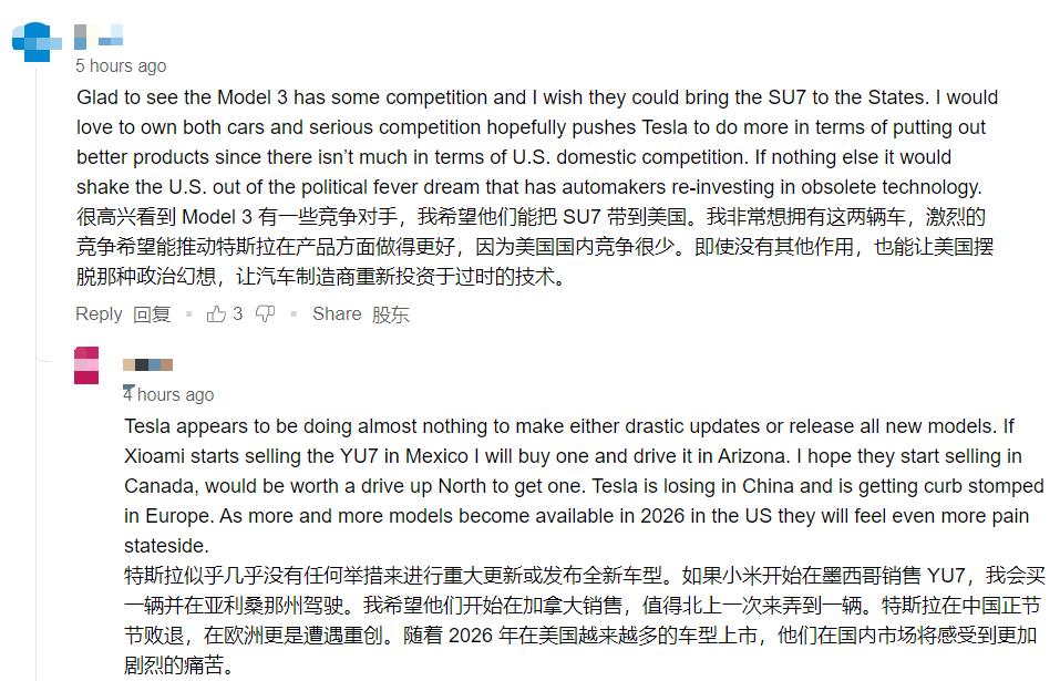 Einige Leute sind der Meinung, dass es gut ist, dass die Verkaufszahlen des SU7 die des Model 3 übertreffen. Ein intensiverer Wettbewerb wird Tesla dazu bringen, mehr Verbesserungen vorzunehmen.