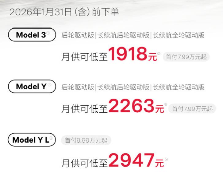 Der Mindesteinzahlbetrag für das Model 3/Y beträgt 79.900 Yuan, und die monatlichen Raten beginnen bei 1.918 Yuan. Für das Model Y L beträgt der Mindesteinzahlbetrag 99.900 Yuan, und die monatlichen Raten beginnen bei 2.947 Yuan.
