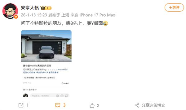 Obwohl das Bild später entfernt wurde, haben Insider mitgeteilt, dass Tesla in China nacheinander ein günstigeres Model 3 und ein günstigeres Model Y einführen wird.