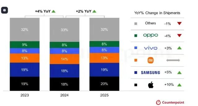 Statistiken von der Marktforschungsfirma Counterpoint Research zeigen, dass der globale Smartphone-Markt im Jahr 2025 aufgrund der steigenden Nachfrage auf den Schwellenmärkten und der verbesserten wirtschaftlichen Dynamik ein Jahr-zu-Jahr-Zuwachs von 2 % bei den globalen Auslieferungen verzeichnete.