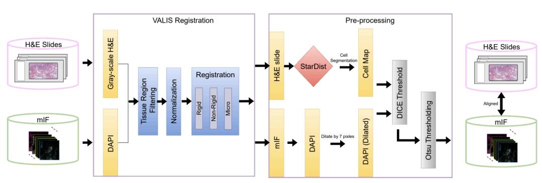 Nachdem die paarweisen Bilder erhalten wurden, besteht die größere Herausforderung darin, wie man daraus hochwertige Trainingsdaten extrahiert. Dazu hat das Team, wie in der folgenden Abbildung gezeigt, einen strengen Verarbeitungsablauf entwickelt: Zuerst wurde das VALIS - Tool verwendet, um die H&E - Bilder und die mIF - Bilder auf Pixelebene exakt auszurichten; dann wurde der StarDist - Algorithmus eingesetzt, um jede Zelle in den Bildern zu identifizieren und zu segmentieren; schließlich wurden die Bildbereiche mit der höchsten Registrierungsqualität anhand des Dice - Koeffizienten ausgewählt.