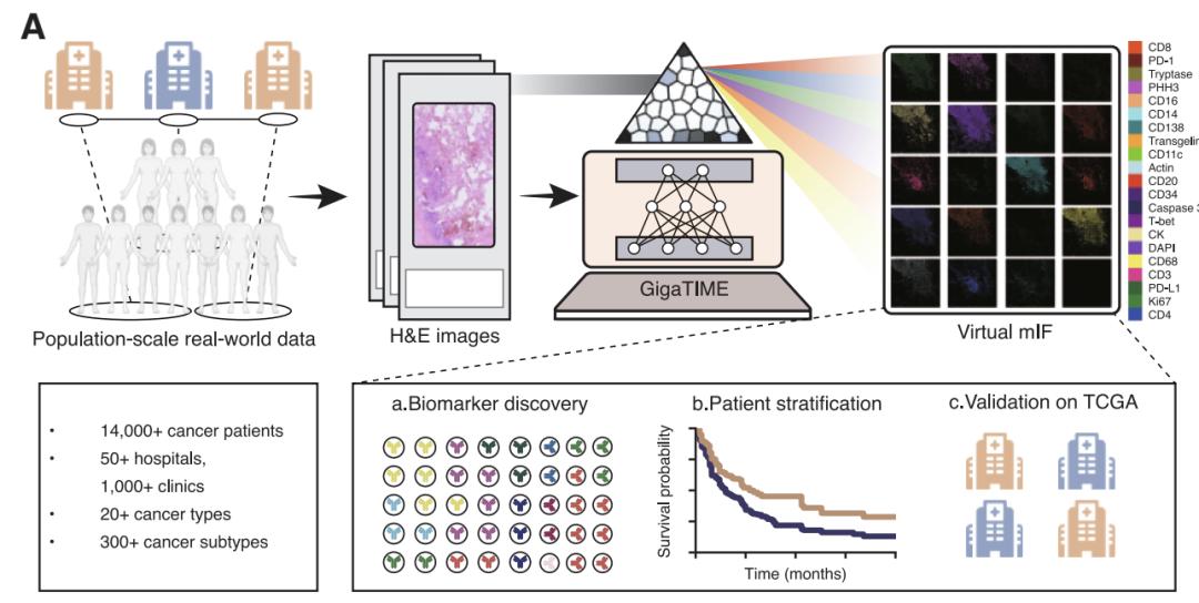 Basierend auf dieser Idee hat das Forschungsteam aus dem Microsoft Research Institute, der University of Washington und Providence Genomics den multimodalen Künstlichen - Intelligenz - Rahmen GigaTIME vorgeschlagen, der auf fortschrittlichen multimodalen Lerntechniken basiert und aus herkömmlichen H&E - Schnitten virtuelle mIF - Atlanten generieren kann. Das Forschungsteam hat es auf die Kohorte von über 14.000 Krebspatienten der Providence Health Care Group in den USA angewendet, die 24 Krebsarten und 306 Subtypen umfasst. Schließlich wurden fast 300.000 virtuelle mIF - Bilder erzeugt, wodurch eine systematische Modellierung des Tumor - Immunmikromilieus in einer großen und vielfältigen Bevölkerung ermöglicht wurde.