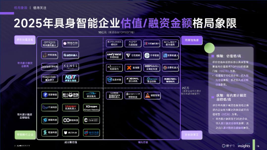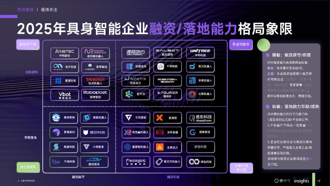Das QbitAI-Thinktank hat die Marktstruktur des Bereichs Embodied Intelligence in Quadranten eingeteilt, basierend auf den Dimensionen Unternehmenswert/Investitionsbetrag und Finanzierungsfähigkeit/Markteinführungskapazität.