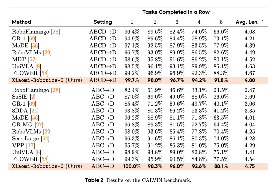 Ob es sich um die LIBERO-Testung der Fähigkeit zur Generalisierung in mehreren Aufgaben oder die CALVIN-Testung der Stabilität bei langfristigen Manipulationen handelt, Xiaomi-Robotics-0 hat in beiden Fällen die Rekorde gebrochen. Seine Erfolgsrate hat die des anerkannten Open-Source-Vergleichsmodells π0.5 übertroffen.